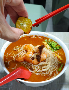 Above left: Eating the Sarawak Laksa as the Sarawakians would with a dollop of sambal and a squeeze of calamansi lime juice